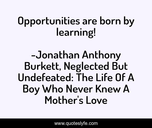 "Jonathan Anthony Burkett, Neglected But Undefeated: The Life Of A Boy Who Never Knew A Mother's Love Quotes." Quoteslyfe.com, 2025. Mon. 08 Dec. 2025. <https://www.quoteslyfe.com/quote/Opportunities-are-born-by-learning-110744>.