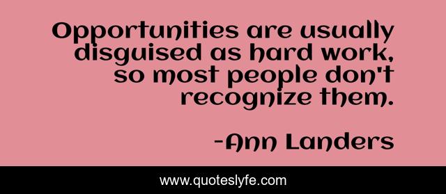 This page presents the quote "Opportunities are usually disguised as hard work, so most people don't recognize them.". Author of this quote is Ann Landers. This quote is about opportunities, hard work,.