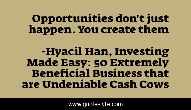 "Hyacil Han, Investing Made Easy: 50 Extremely Beneficial Business that are Undeniable Cash Cows Quotes." Quoteslyfe.com, 2025. Fri. 05 Dec. 2025. <https://www.quoteslyfe.com/quote/Opportunities-don-t-just-happen-You-create-110065>.