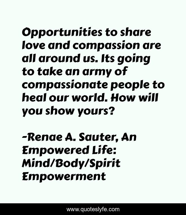 This page presents the quote "Opportunities to share love and compassion are all around us. Its going to take an army of compassionate people to heal our world. How will you show yours?". Author of this quote is Renae A. Sauter, An Empowered Life: Mind/Body/Spirit Empowerment. This quote is about empowerment, empathy, compassion, motivation, wisdom, mind-body-spirit, self-help, inspiration,.