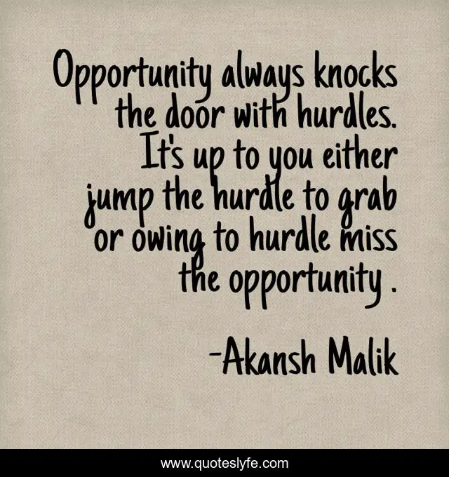This page presents the quote "Opportunity always knocks the door with hurdles. It's up to you either jump the hurdle to grab or owing to hurdle miss the opportunity .". Author of this quote is Akansh Malik. This quote is about confidence, positive, motivational, optimistic, inspirational, enthusiasm, opportunity,.