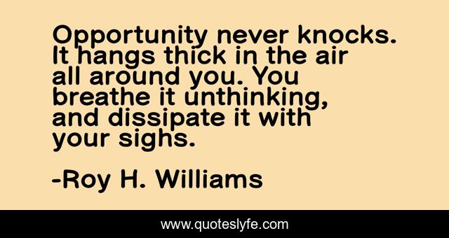 This page presents the quote "Opportunity never knocks. It hangs thick in the air all around you. You breathe it unthinking, and dissipate it with your sighs.". Author of this quote is Roy H. Williams. .