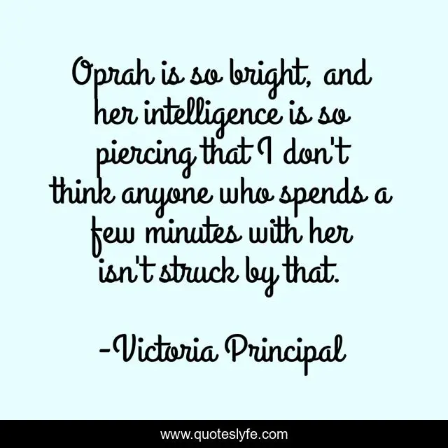 This page presents the quote "Oprah is so bright, and her intelligence is so piercing that I don't think anyone who spends a few minutes with her isn't struck by that.". Author of this quote is Victoria Principal. This quote is about bright, think, her,.
