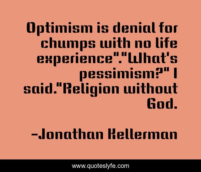 This page presents the quote "Optimism is denial for chumps with no life experience"."What's pessimism?" I said."Religion without God.". Author of this quote is Jonathan Kellerman. This quote is about pessimism, optimism,.