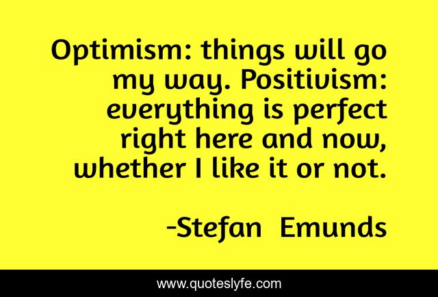 This page presents the quote "Optimism: things will go my way. Positivism: everything is perfect right here and now, whether I like it or not.". Author of this quote is Stefan Emunds. This quote is about positivism, psychology, success, optimism, positive-thinking, fulfillment, inspirational, enthusiasm, wisdom,.