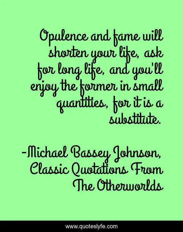 This page presents the quote "Opulence and fame will shorten your life, ask for long life, and you'll enjoy the former in small quantities, for it is a substitute.". Author of this quote is Michael Bassey Johnson, Classic Quotations From The Otherworlds. This quote is about long-life, death, option, enjoyment, opulence, premature-death, substitution, fame, substitute,.