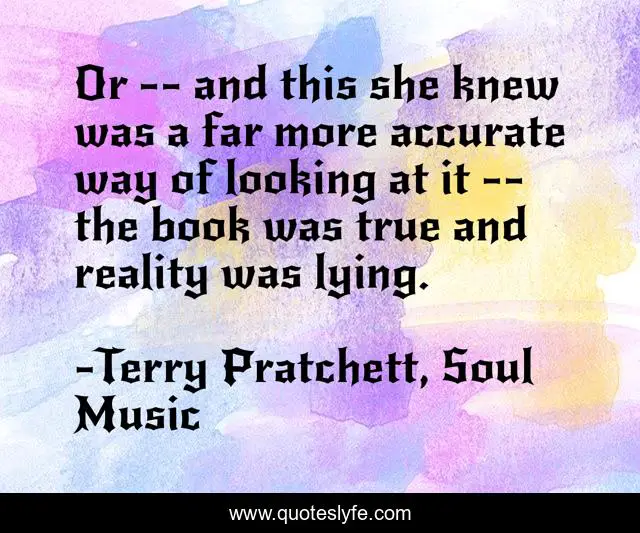 This page presents the quote "Or -- and this she knew was a far more accurate way of looking at it -- the book was true and reality was lying.". Author of this quote is Terry Pratchett, Soul Music. This quote is about humor, reality,.