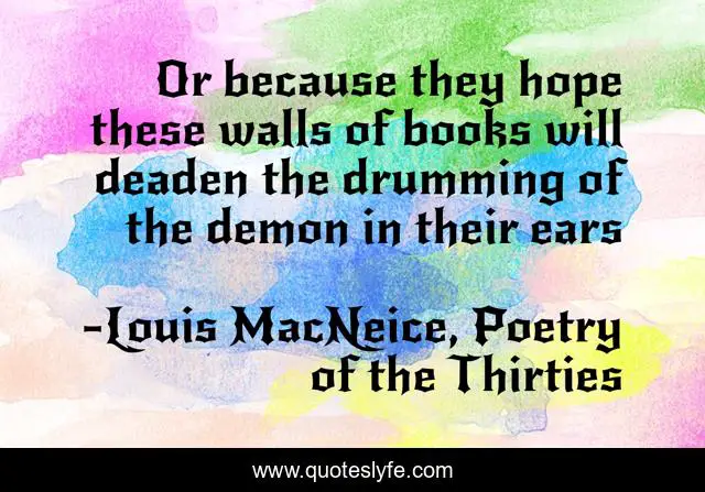 This page presents the quote "Or because they hope these walls of books will deaden the drumming of the demon in their ears". Author of this quote is Louis MacNeice, Poetry of the Thirties. This quote is about depressing, me, real,.