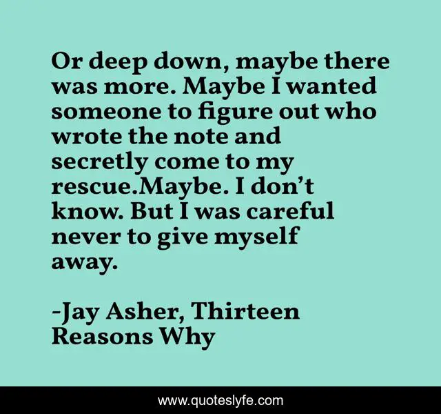 This page presents the quote "Or deep down, maybe there was more. Maybe I wanted someone to figure out who wrote the note and secretly come to my rescue.Maybe. I don’t know. But I was careful never to give myself away.". Author of this quote is Jay Asher, Thirteen Reasons Why. This quote is about confusion, secret, self-analysis, salvation, longing,.