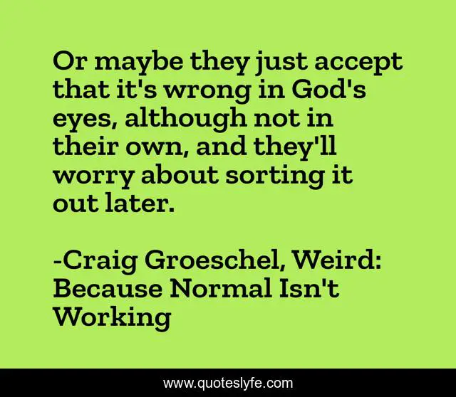 This page presents the quote "Or maybe they just accept that it's wrong in God's eyes, although not in their own, and they'll worry about sorting it out later.". Author of this quote is Craig Groeschel, Weird: Because Normal Isn't Working. This quote is about and, eyes, own, later, they, just, maybe, it-s, it,.