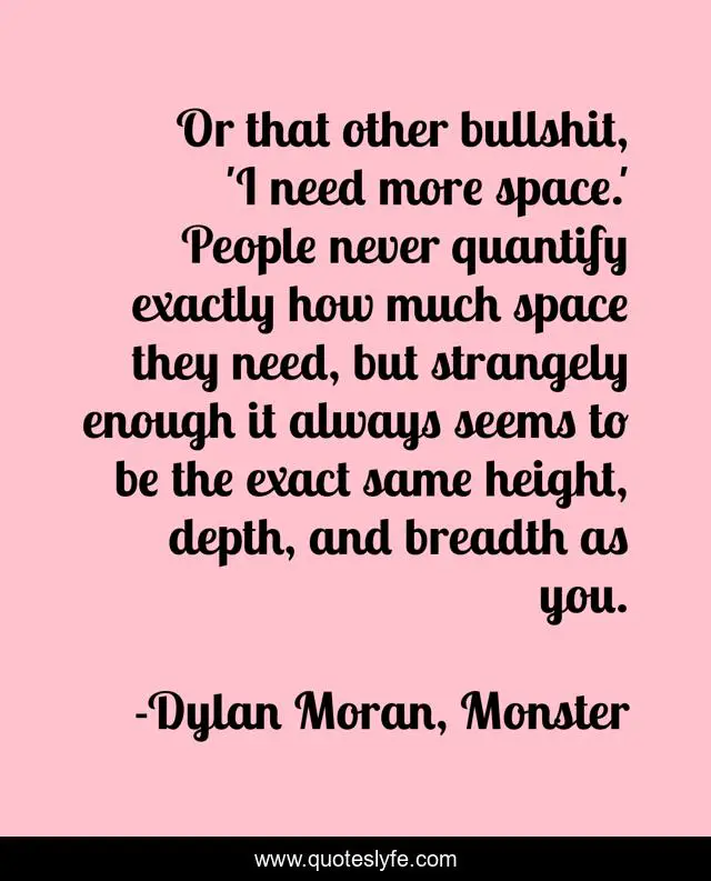 This page presents the quote "Or that other bullshit, 'I need more space.' People never quantify exactly how much space they need, but strangely enough it always seems to be the exact same height, depth, and breadth as you.". Author of this quote is Dylan Moran, Monster. .