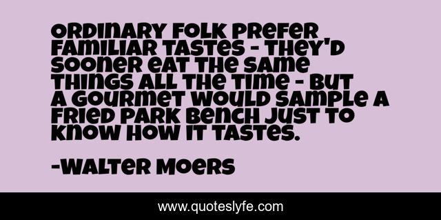 This page presents the quote "Ordinary folk prefer familiar tastes - they'd sooner eat the same things all the time - but a gourmet would sample a fried park bench just to know how it tastes.". Author of this quote is Walter Moers. This quote is about food, humor, comfort-food, gourmets,.