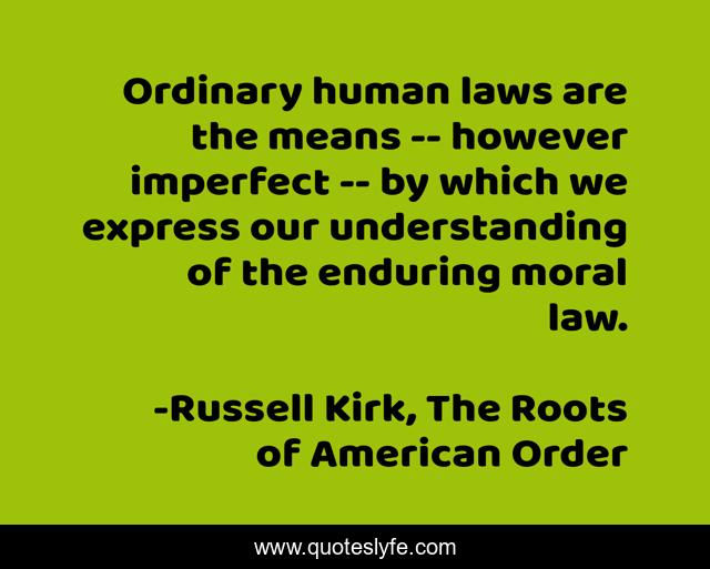 This page presents the quote "Ordinary human laws are the means -- however imperfect -- by which we express our understanding of the enduring moral law.". Author of this quote is Russell Kirk, The Roots of American Order. This quote is about law, lawyers, morals, natural-law,.