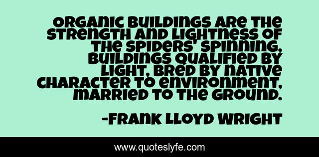 This page presents the quote "Organic buildings are the strength and lightness of the spiders' spinning, buildings qualified by light, bred by native character to environment, married to the ground.". Author of this quote is Frank Lloyd Wright. This quote is about light, character,.