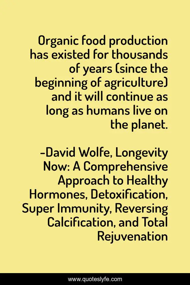 "David Wolfe, Longevity Now: A Comprehensive Approach to Healthy Hormones, Detoxification, Super Immunity, Reversing Calcification, and Total Rejuvenation Quotes." Quoteslyfe.com, 2025. Fri. 05 Dec. 2025. <https://www.quoteslyfe.com/quote/Organic-food-production-has-existed-for-thousands-177068>.