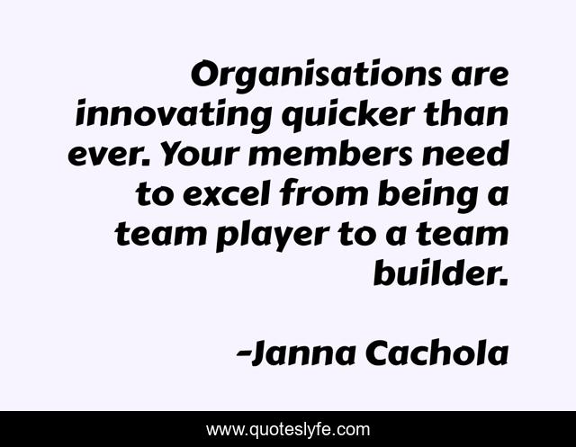 This page presents the quote "Organisations are innovating quicker than ever. Your members need to excel from being a team player to a team builder.". Author of this quote is Janna Cachola. This quote is about team-builder, team-spirit, high-performance-organisations, teamwork, team, leadership-characteristics, leaders,.