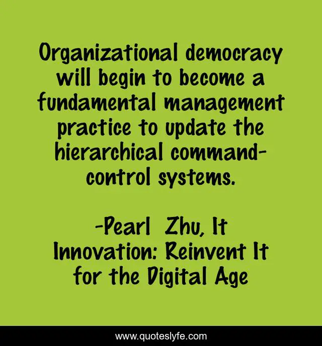 This page presents the quote "Organizational democracy will begin to become a fundamental management practice to update the hierarchical command-control systems.". Author of this quote is Pearl Zhu, It Innovation: Reinvent It for the Digital Age. This quote is about it-innovation, democracy, innovation,.