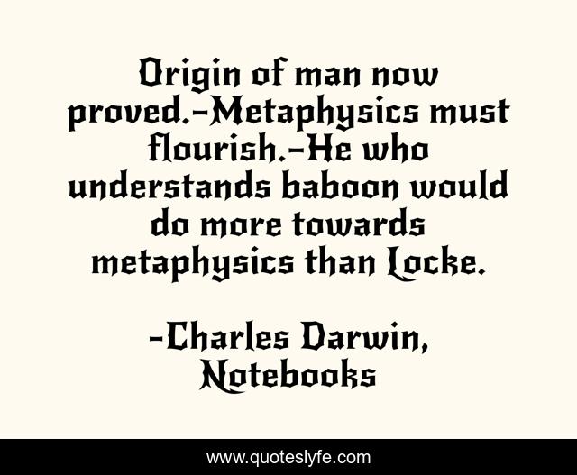 This page presents the quote "Origin of man now proved.—Metaphysics must flourish.—He who understands baboon would do more towards metaphysics than Locke.". Author of this quote is Charles Darwin, Notebooks. This quote is about evolution, metaphysics, darwinism,.
