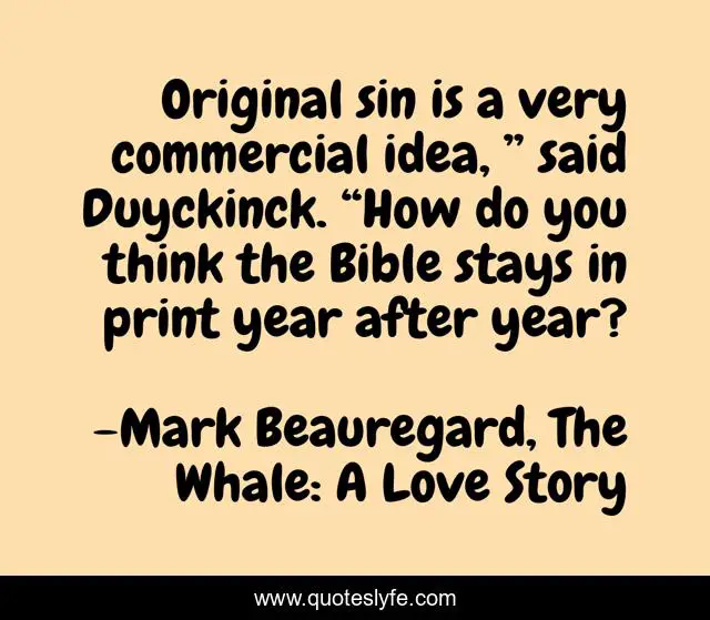 This page presents the quote "Original sin is a very commercial idea, ” said Duyckinck. “How do you think the Bible stays in print year after year?". Author of this quote is Mark Beauregard, The Whale: A Love Story. This quote is about original-sin, bible,.