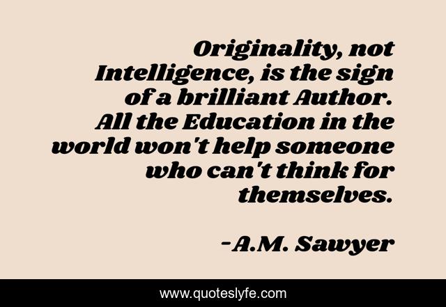 This page presents the quote "Originality, not Intelligence, is the sign of a brilliant Author. All the Education in the world won't help someone who can't think for themselves.". Author of this quote is A.M. Sawyer. This quote is about originality, author,.