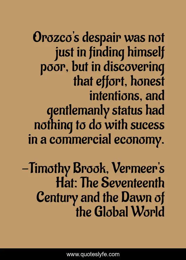 This page presents the quote "Orozco's despair was not just in finding himself poor, but in discovering that effort, honest intentions, and gentlemanly status had nothing to do with sucess in a commercial economy.". Author of this quote is Timothy Brook, Vermeer's Hat: The Seventeenth Century and the Dawn of the Global World. .
