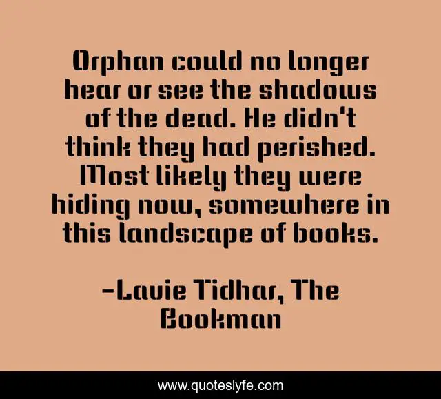 This page presents the quote "Orphan could no longer hear or see the shadows of the dead. He didn't think they had perished. Most likely they were hiding now, somewhere in this landscape of books.". Author of this quote is Lavie Tidhar, The Bookman. This quote is about books, dead, library,.
