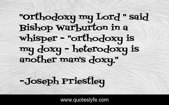 This page presents the quote ""Orthodoxy my Lord " said Bishop Warburton in a whisper - "orthodoxy is my doxy - heterodoxy is another man's doxy."". Author of this quote is Joseph Priestley. .