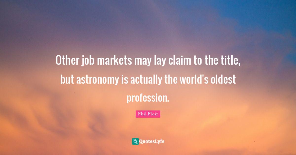 This page presents the quote "Other job markets may lay claim to the title, but astronomy is actually the world's oldest profession.". Author of this quote is Phil Plait. This quote is about may, profession, jobs, titles, astronomy, world,.