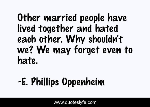 This page presents the quote "Other married people have lived together and hated each other. Why shouldn't we? We may forget even to hate.". Author of this quote is E. Phillips Oppenheim. This quote is about hate, marriage, humour, relations,.