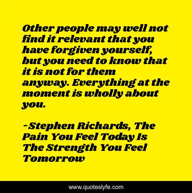 This page presents the quote "Other people may well not find it relevant that you have forgiven yourself, but you need to know that it is not for them anyway. Everything at the moment is wholly about you.". Author of this quote is Stephen Richards, The Pain You Feel Today Is The Strength You Feel Tomorrow. This quote is about empowering, confidence, moving-on-and-letting-go, healing-the-past, motivational, forgive, stephen-richards-author, stephen-richards, suffering,.