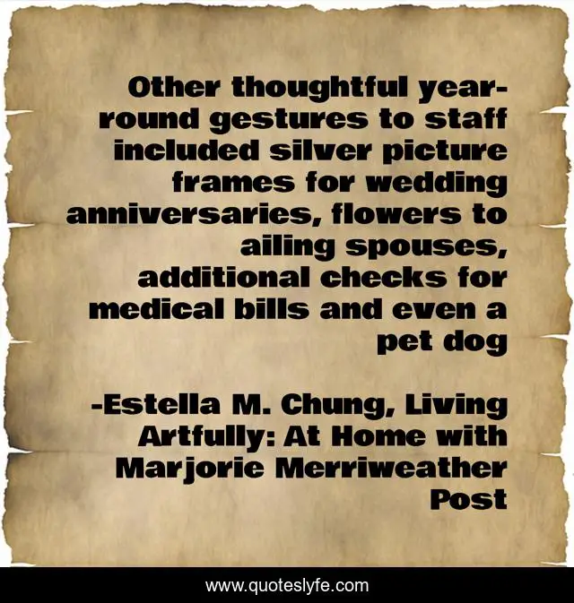 This page presents the quote "Other thoughtful year-round gestures to staff included silver picture frames for wedding anniversaries, flowers to ailing spouses, additional checks for medical bills and even a pet dog". Author of this quote is Estella M. Chung, Living Artfully: At Home with Marjorie Merriweather Post. This quote is about lifestyle, biography, estate,.