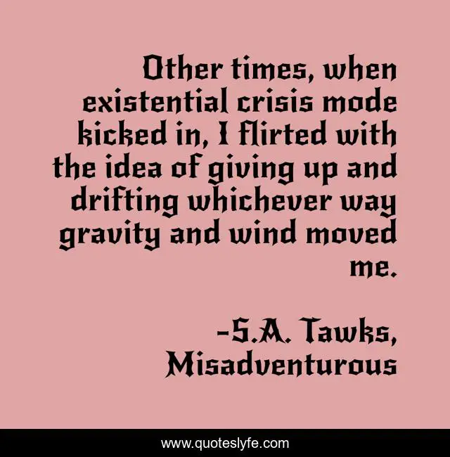 "S.A. Tawks, Misadventurous Quotes." Quoteslyfe.com, 2025. Fri. 05 Dec. 2025. <https://www.quoteslyfe.com/quote/Other-times-when-existential-crisis-mode-kicked-151673>.