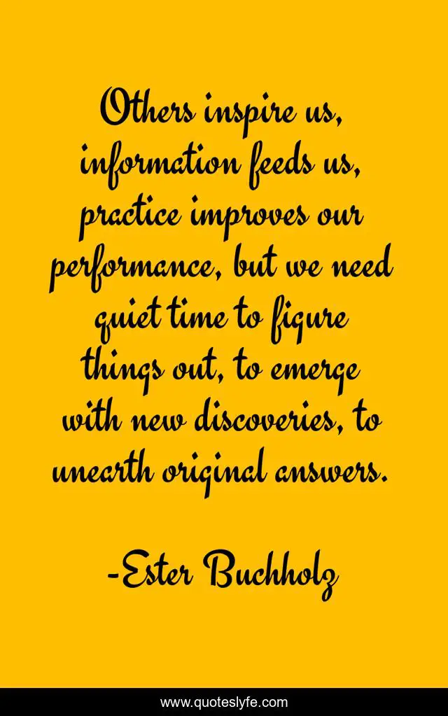This page presents the quote "Others inspire us, information feeds us, practice improves our performance, but we need quiet time to figure things out, to emerge with new discoveries, to unearth original answers.". Author of this quote is Ester Buchholz. This quote is about creativity, original, quiet,.