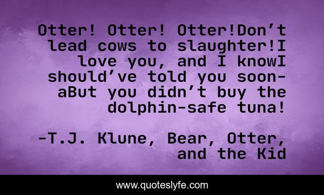 This page presents the quote "Otter! Otter! Otter!Don’t lead cows to slaughter!I love you, and I knowI should’ve told you soon-aBut you didn’t buy the dolphin-safe tuna!". Author of this quote is T.J. Klune, Bear, Otter, and the Kid. This quote is about funny, comedy, poetry,.