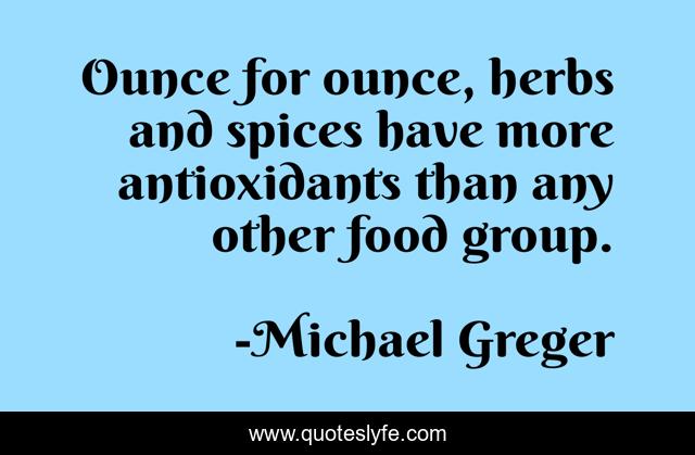This page presents the quote "Ounce for ounce, herbs and spices have more antioxidants than any other food group.". Author of this quote is Michael Greger. This quote is about herbs, spices, group,.