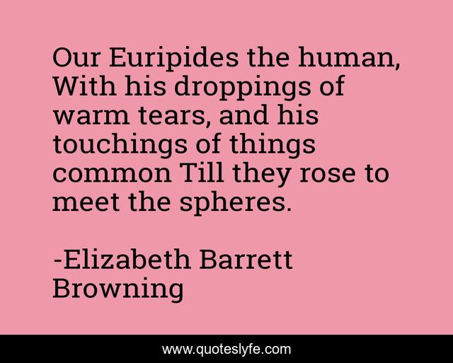 This page presents the quote "Our Euripides the human, With his droppings of warm tears, and his touchings of things common Till they rose to meet the spheres.". Author of this quote is Elizabeth Barrett Browning. This quote is about enthusiasm, historical, humour, inspirational,.