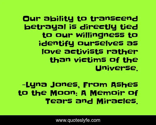"Lyna Jones, From Ashes to the Moon: A Memoir of Tears and Miracles. Quotes." Quoteslyfe.com, 2025. Fri. 05 Dec. 2025. <https://www.quoteslyfe.com/quote/Our-ability-to-transcend-betrayal-is-directly-104692>.