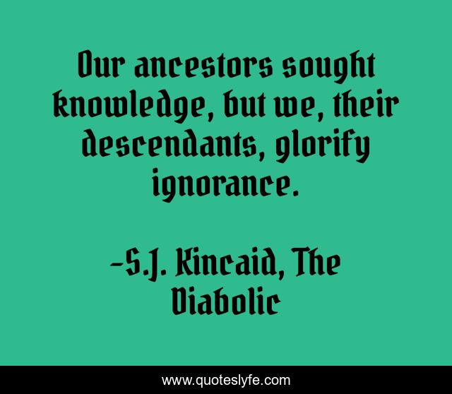 This page presents the quote "Our ancestors sought knowledge, but we, their descendants, glorify ignorance.". Author of this quote is S.J. Kincaid, The Diabolic. This quote is about the-diabolic, ignorance, knowledge,.