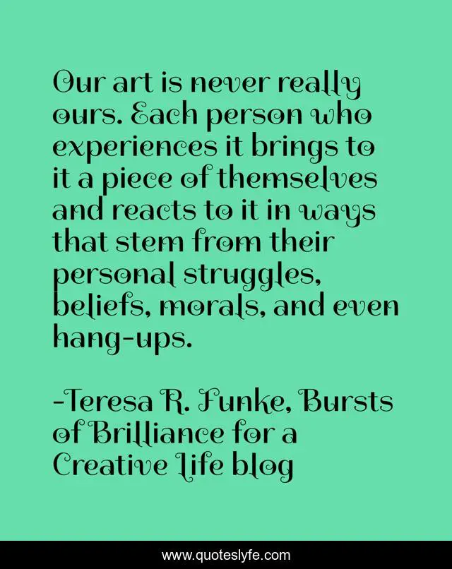 This page presents the quote "Our art is never really ours. Each person who experiences it brings to it a piece of themselves and reacts to it in ways that stem from their personal struggles, beliefs, morals, and even hang-ups.". Author of this quote is Teresa R. Funke, Bursts of Brilliance for a Creative Life blog. This quote is about art, morals, personal-growth, brilliance, entrepreneurship, shared-experiences, inspiration,.