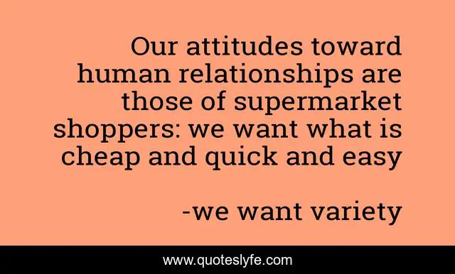 This page presents the quote "Our attitudes toward human relationships are those of supermarket shoppers: we want what is cheap and quick and easy". Author of this quote is we want variety. .