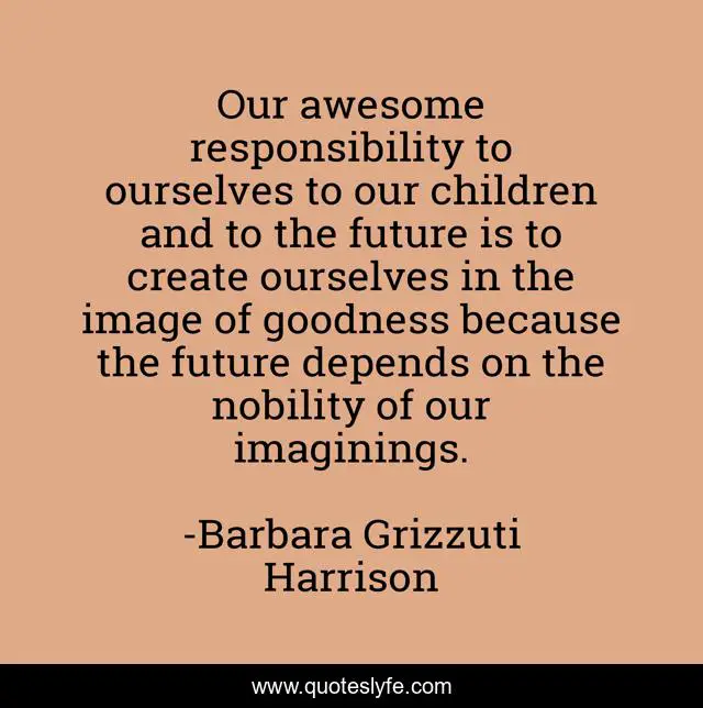 This page presents the quote "Our awesome responsibility to ourselves to our children and to the future is to create ourselves in the image of goodness because the future depends on the nobility of our imaginings.". Author of this quote is Barbara Grizzuti Harrison. This quote is about self, reliance,.