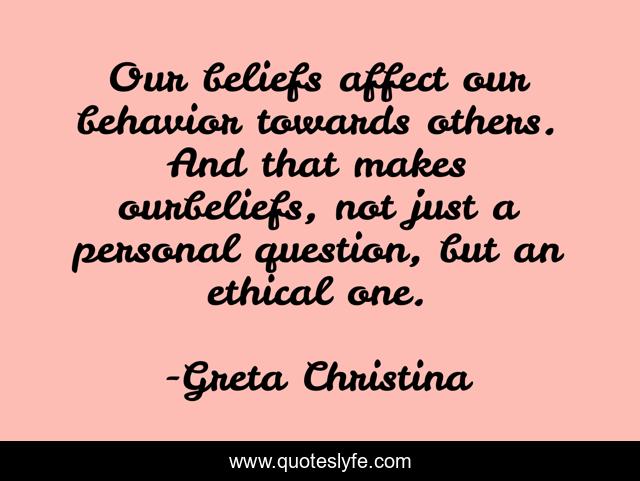 This page presents the quote "Our beliefs affect our behavior towards others. And that makes ourbeliefs, not just a personal question, but an ethical one.". Author of this quote is Greta Christina. This quote is about sociology, atheists, religion-and-philosophy, atheism, society, atheist-argument, religion,.