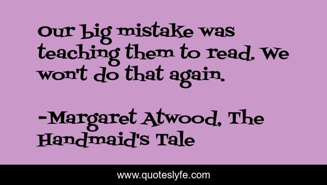 This page presents the quote "Our big mistake was teaching them to read. We won't do that again.". Author of this quote is Margaret Atwood, The Handmaid's Tale. This quote is about b-frederick-judd, women,.