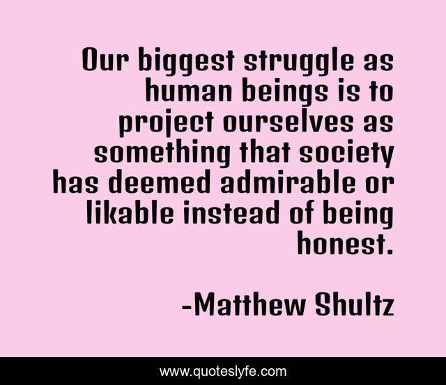 This page presents the quote "Our biggest struggle as human beings is to project ourselves as something that society has deemed admirable or likable instead of being honest.". Author of this quote is Matthew Shultz. This quote is about struggle, human, honest,.