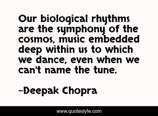 This page presents the quote "Our biological rhythms are the symphony of the cosmos, music embedded deep within us to which we dance, even when we can't name the tune.". Author of this quote is Deepak Chopra. This quote is about art, quotes, vibe, quote, within, muisc, dance, music, deepak-chopra,.