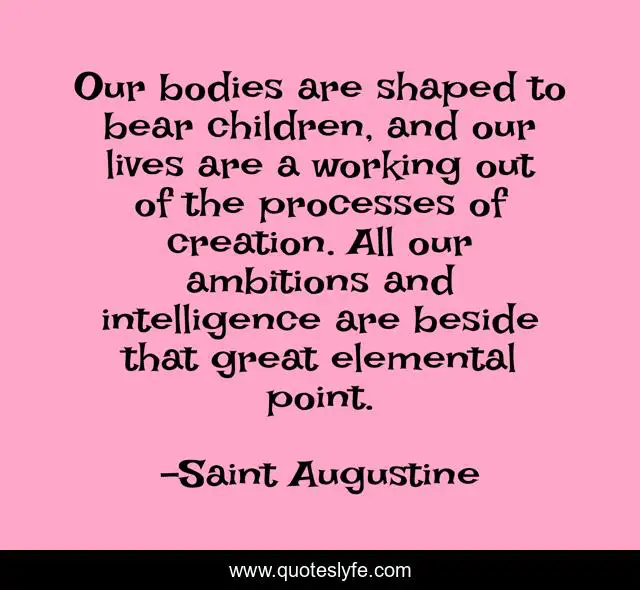 This page presents the quote "Our bodies are shaped to bear children, and our lives are a working out of the processes of creation. All our ambitions and intelligence are beside that great elemental point.". Author of this quote is Saint Augustine. This quote is about great, children, working,.