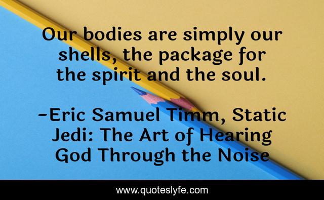 This page presents the quote "Our bodies are simply our shells, the package for the spirit and the soul.". Author of this quote is Eric Samuel Timm, Static Jedi: The Art of Hearing God Through the Noise. This quote is about body, art, shell, love, christ, package, god, soul, paint,.
