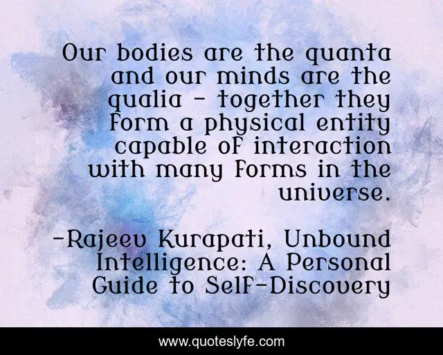 This page presents the quote "Our bodies are the quanta and our minds are the qualia - together they form a physical entity capable of interaction with many forms in the universe.". Author of this quote is Rajeev Kurapati, Unbound Intelligence: A Personal Guide to Self-Discovery. This quote is about god, quanta, mind-body, qualia, universe,.