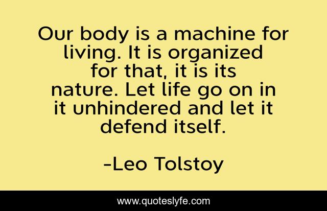 This page presents the quote "Our body is a machine for living. It is organized for that, it is its nature. Let life go on in it unhindered and let it defend itself.". Author of this quote is Leo Tolstoy. This quote is about body, living, life,.