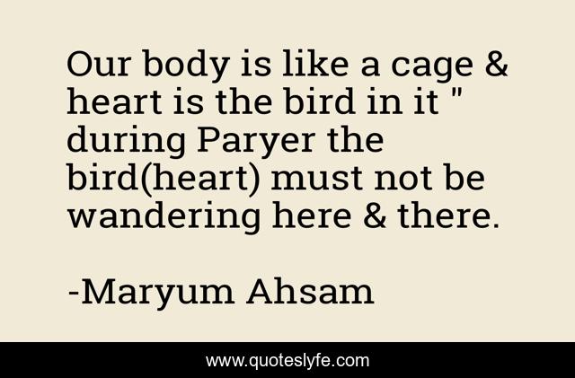 This page presents the quote "Our body is like a cage & heart is the bird in it " during Paryer the bird(heart) must not be wandering here & there.". Author of this quote is Maryum Ahsam. This quote is about namaz, salah, islam, prayer,.
